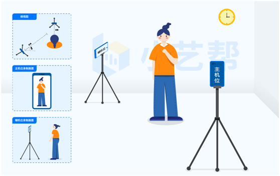 空中乘务专业采用小艺帮双机位直播的方式,全程时间为12分钟(包含审题、作答和提交视频、机动时间)。必须在9:12之前完成所有视频的录制和提交。未在考试规定时间内完成视频录制并提交的,将被视为放弃。视频录制要求聚焦清楚、画面清晰、声音真实无杂音。考生因未按要求操作或拍摄不清晰、不完整等导致的后果,责任自负。双机位摆放示意图如下所示。