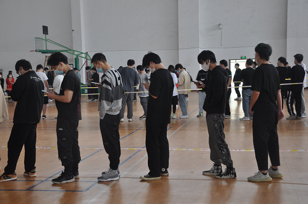 现场设置单向出入口,检测通道设置等待区、登记区、采样区等区域。师生员工错时错峰,全程佩戴口罩,间隔一米排队,在工作人员和志愿者的引导下,有序扫码,依次进行核酸检测,即采即走,检测工作快速、有序开展。