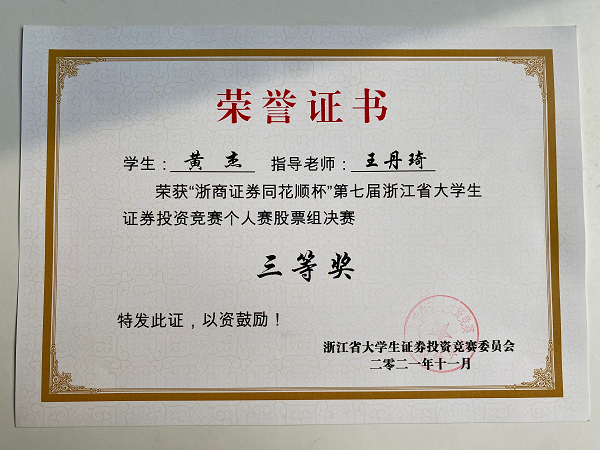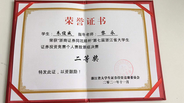 近日,第七届浙江省大学生证券投资竞赛在温州大学商学院落下帷幕,本届竞赛共有来自全省72所高校的1116支团队参赛,共评出省一等奖78项,省二等奖157,省三等奖237项。经过实测、网络评审、全程在线答辩等环节的激烈角逐,我校财务与管理学院朱俊威同学在个人赛股票组决赛中荣获二等奖(指导教师:黎永),财务与会计院黄杰同学在个人赛股票组决赛中荣获三等奖(指导教师:王丹琦)。
