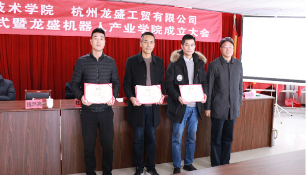 依托龙盛机器人产业学院,学校还成立了大师工作室,特聘请杭州龙盛工贸有限公司金忠豪、钱浩亮、李旭红同志为学院客座教授。会议现场,高创宽为三位工匠大师颁发了聘书。