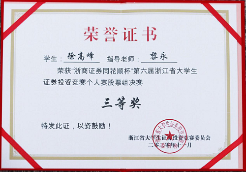 最终,我校代表队夺取了“第六届浙江省大学生证券投资竞赛团体赛市场交易”一等奖!