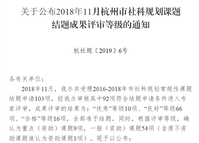 根据杭州市哲学社会科学规划领导小组办公室文件《关于公布2018年11月杭州市社科规划课题结题成果评审等级的通知》(杭社规〔2019〕6号),我校两项课题顺利通过专家评审予以结题,其中孙亚敏博士主持的《老龄化背景下儿童文学中老人形象研究》(课题编号为Z17JC048)确认为重点课题,评审等级为优秀;许琼老师主持的《网络公益的社会影响与政府规制研究》(课题编号为M18JC018)确认为一般课题,评审等级为良好。据悉,此次结题申请共103项,其中,92项符合结题申请条件进入专家评审,经评审,“优秀”等级10项、“良好”等级66项、“合格”等级16项。