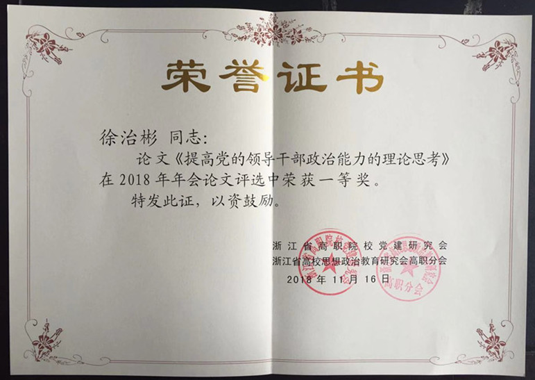 12月11日至12日,浙江省高职院校党建研究会、浙江省高校思想政治教育研究会高职分会2018年年会在台州举行,会议由台州职业技术学院承办。会上对年会优秀论文进行了表彰,从130篇论文中,评出67篇,其中,一等奖4篇,二等奖24篇,三等奖39篇。我校徐治彬教授提交的论文《提高党的领导干部政治能力的理论思考》荣获年会优秀论文一等奖 ,并在年会上作了交流发言。