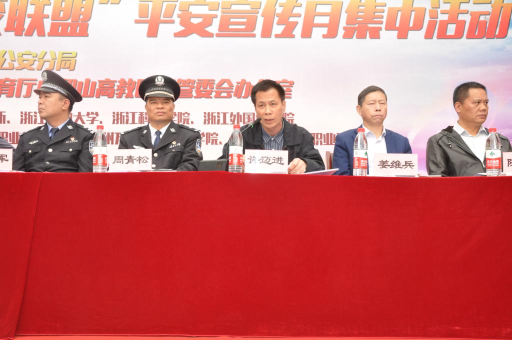 11月5日下午,由西湖区公安分局主办,小和山高教园区管委会办公室承办的“平安高校联盟”平安宣传月集中活动启动仪式在我校举行。副院长许迈进出席启动仪式并致辞,西湖分局党委委员、副局长程军,杭州市局经文保支队副支队长周青松,省教育厅小和山高教园区办主任陈雷,留下派出所所长祝匡海、副所长金玉荣,“平安高校联盟”成员高校保卫处处长出席仪式,园区内近400名师生参加本次活动。