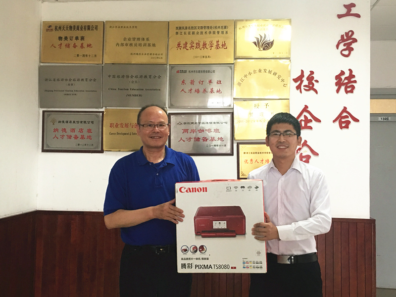 本次捐赠的教学仪器设备有佳能TS8180无线WiFi喷墨打印机一台,带录音和回放功能的新科大功率无线导游讲解话筒四台。这些教学仪器设备显著地提高了校内实训教学的质量和效率。校企合作处主任张崇利教授、管理系主任汪亚明教授、管理系党总支书记李晓梅老师,管理系旅游管理专业教师一起参与了此次捐赠仪式。