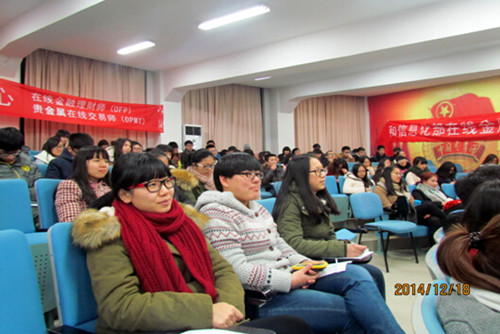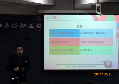讲座期间,蒋宏炳先生就个人奋斗历程做背景针对大学生职业规划做了深刻的分析。他着重介绍了互联网金融:一、为什么要做职业规划;二、怎样做职业规划;三、最好的职业规划是什么;四、最佳机遇“互联网金融”;五、如何把规划变成现实;六、你的未来。蒋老师诙谐幽默的演讲令全场气氛十分活跃,并对金融行业和投资发表了自己的看法,激发了同学们对金融投资的热情。