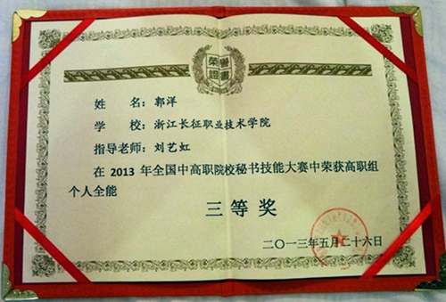 2013年5月25至26日,语言系文秘专业杜盼盼、刘俊江、郭洋3位同学在刘艺虹老师带领下代表我院首次参加全国秘书职业技能大赛,荣获团体三等,参赛的3位同学还分别获得了秘书职业基础知识、个人全能、工作技能3个单项三等奖。
