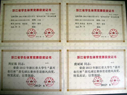 5月30日至6月3日,2012年浙江省大学生“嘉兴农行杯”羽毛球比赛在嘉兴学院举行,领队张自强、教练员曹桂霞老师率领我院羽毛球队,不畏强手,奋勇拼搏,陈学伟和商思思同学的混双组合一路过关斩将摘得亚军,沈旭同学力夺男单第五名,周征强和虞斌斌同学获得了体育道德风尚奖,再次为学院争得了荣誉,也再次延续了院羽毛球队在省级比赛上的辉煌战绩。