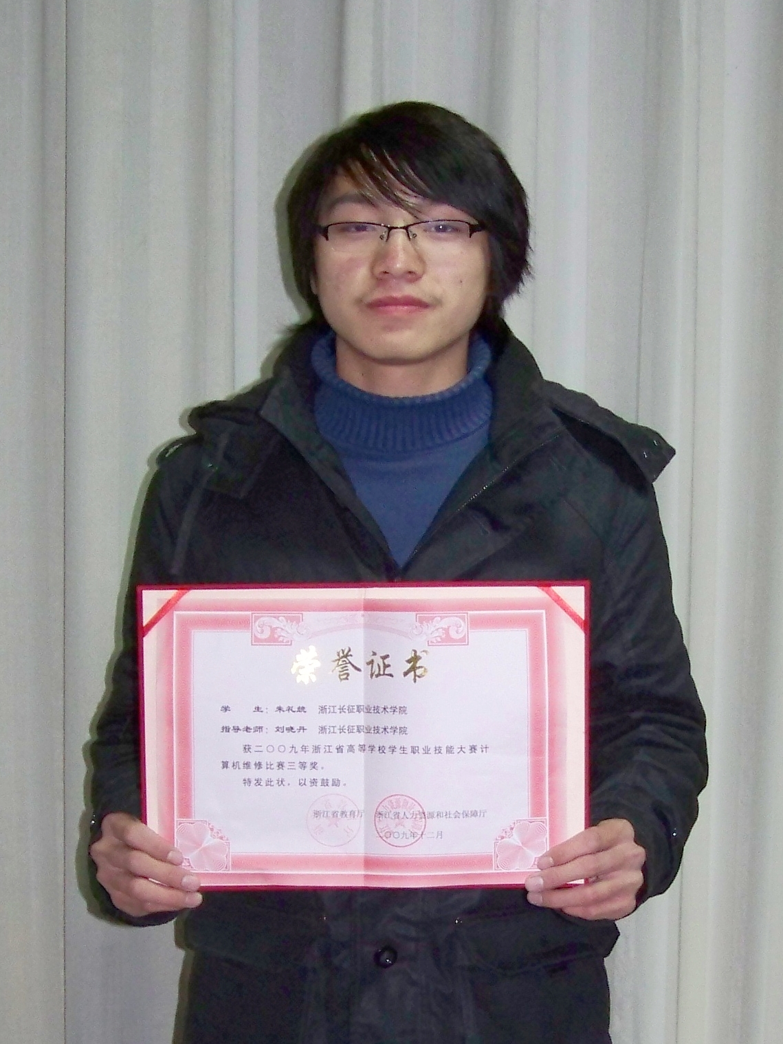 11月13日,2009年全省大学生计算机维修工技能竞赛在浙江金融职业学院举行,全省共37所院校参赛。经过激烈角逐,我院计算机系朱礼统同学喜获三等奖。