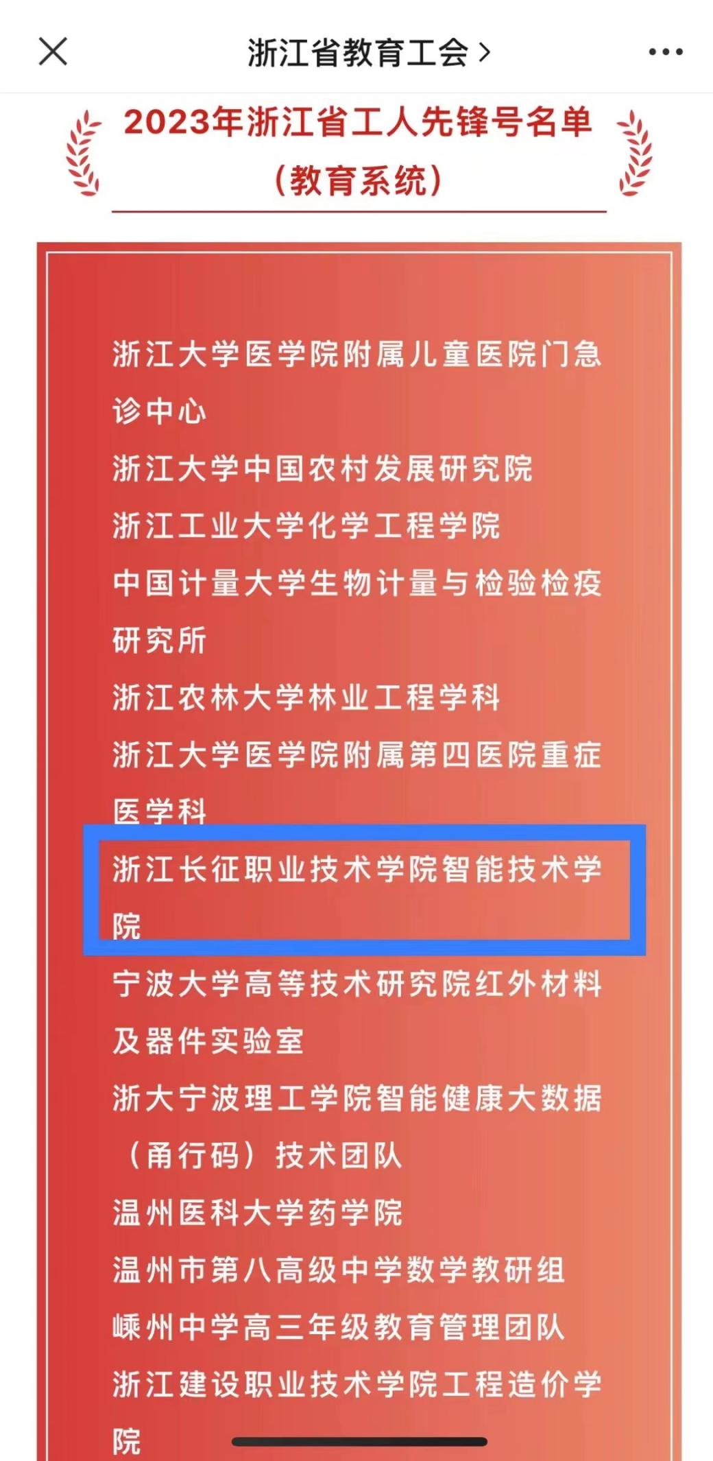 3月31日,浙江省总工会发布了《关于表彰2023年浙江省五一劳动奖状、奖章和工人先锋号的决定》,一批先进集体和个人受到表彰,其中,我校智能技术学院荣获“浙江省工人先锋号”荣誉称号。