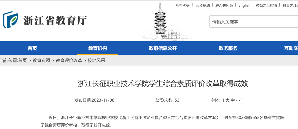 11月8日,浙江省教育厅网站以《欧美激情综合色综合啪啪五月,日韩欧美综合,久久综合噜噜激激的五月天,久久久综合香蕉尹人综合网学生综合素质评价改革取得成效》为题,报道了我校持续深化教育评价改革,加快推动教育评价改革的标准化、体系化、规范化、数字化发展,不断提升学校治理能力和人才培养质量的经验做法。这是2022年9月5日我校《浙江民营小微企业复合型人才综合素质评价改革》成功入选浙江省深化新时代教育评价改革试点项目以来,教育厅网站第二次报道我校试点工作取得的成效。
