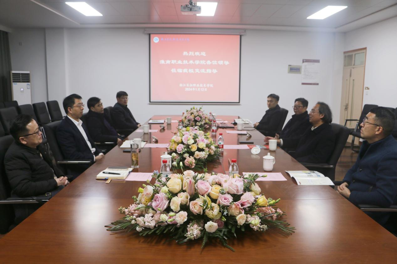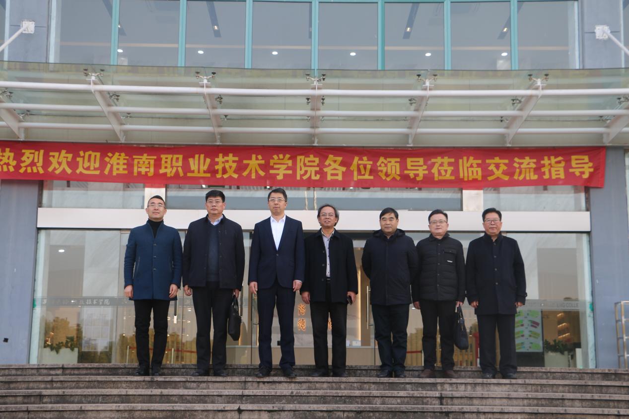 1月12日,淮南职业技术学院党委书记、校长袁爱清,副校长胡道成一行4人来我校调研交流,学校党委书记、常务副校长王其军,副校长杜宝山、冯新红接待了袁爱清一行,并全程陪同来访人员参观了学校实训中心、图书馆等地。学校相关部门负责人参加了调研交流。