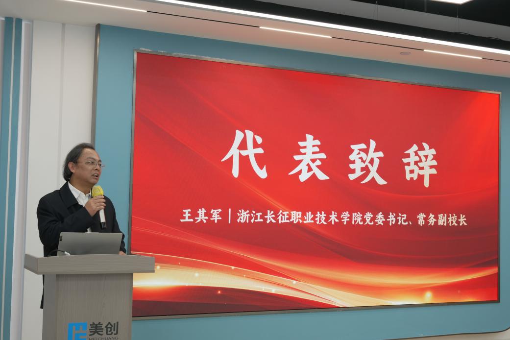 王其军在致辞中对美创科技长期以来对学校发展的支持和帮助表示衷心感谢,并指出校企合作是高等教育与产业发展相结合的重要途径,是提升人才培养质量、推动产学研用深度融合的关键环节。他强调,学校一直致力于与企业深度合作,共同探索人才培养的新模式、新路径,为社会输送更多高素质高技能人才。