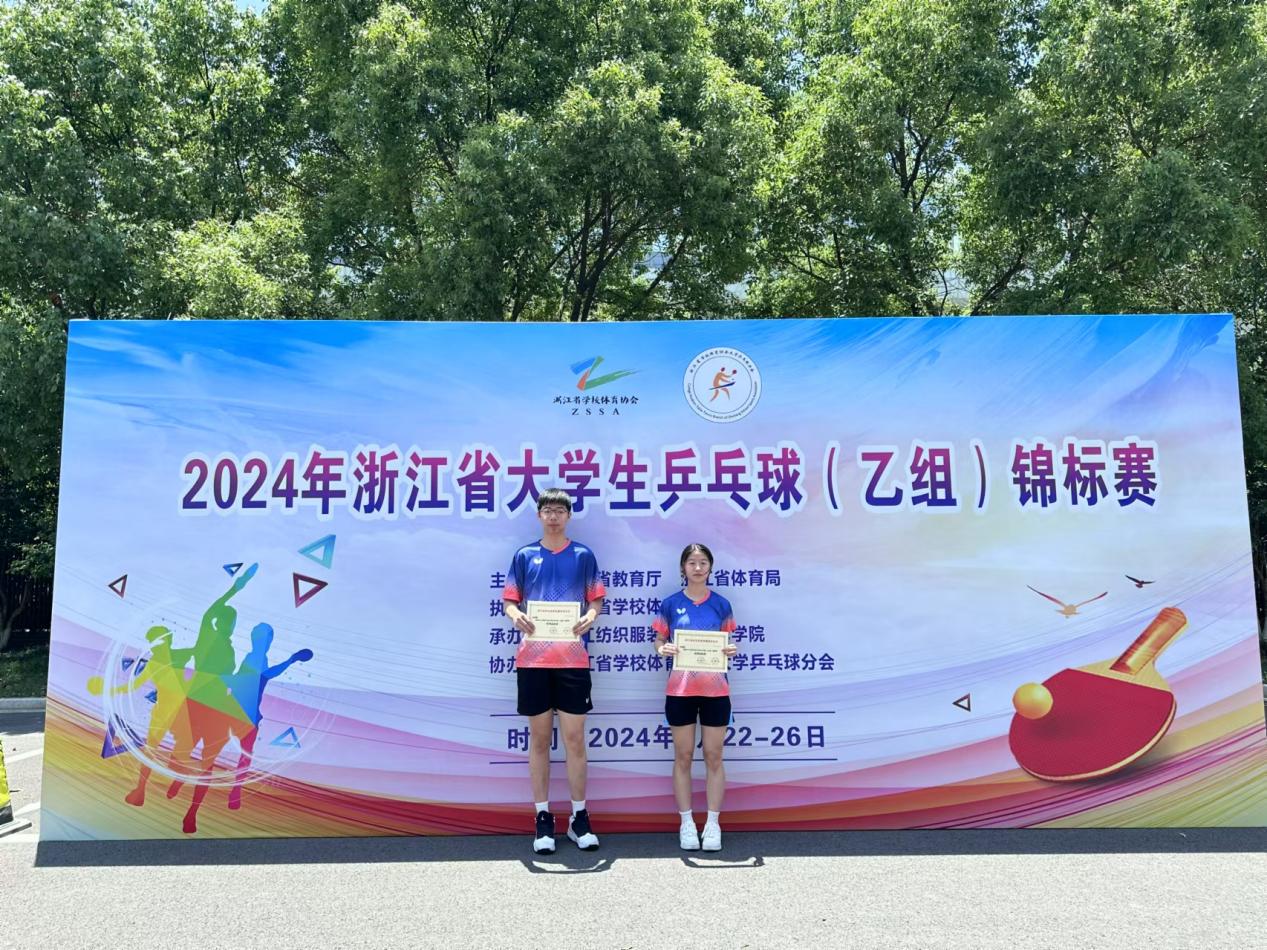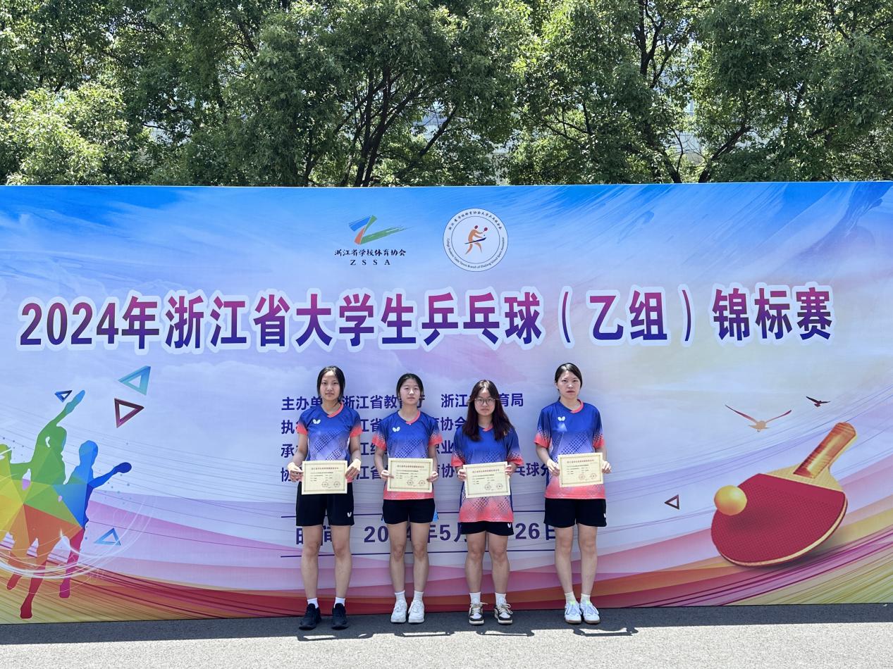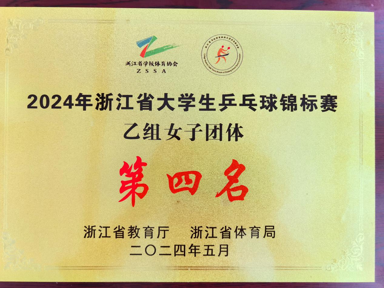 5月22日—26日,2024年浙江省大学生乒乓球锦标赛(乙组)在浙江纺织服装职业技术学院顺利落下帷幕,我校运动员林雨彤、许帆帆、张金煜、沈圆袁斩获女子团体项目第四名的优异成绩,朱羿翰、林雨彤同学获得“优秀运动员”荣誉称号。