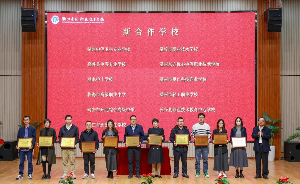 会上,学校为湖州中等卫生专业学校等11所新达成合作的中职学校授予“中高职一体化生源基地”称号。
