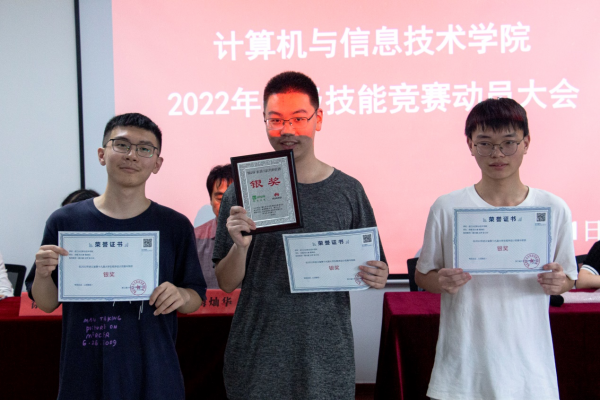 大会回顾了上半年学院师生在技能大赛中取得的成绩,并对下半年的技能竞赛参赛、备赛等工作进行了部署,为在2022年浙江省大学生程序设计竞赛、“蓝桥杯”软件设计大赛、学校信息安全管理与评估大赛中取得佳绩的同学们进行了颁奖。沈萍对各指导老师、参赛学生备战技能大赛的辛勤付出予以肯定,她指出,技能大赛是培养选拔技能型人才的重要平台,也是深化教育教学改革成果的重要检验途径,全院师生要高度重视各类竞赛,指导教师要对赛程赛项规则多做研究,组织学生进行有效练习;参赛学生要对标找差,高效训练,在做好日常训练的同时也要合理作息,确保取得更好的成绩。