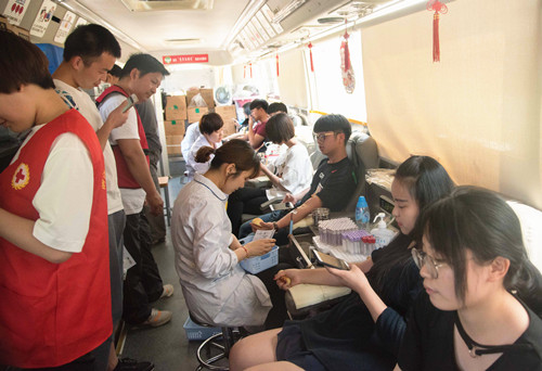 活动现场氛围热烈有序,广大师生首先要详细阅读献血知识宣传册再登记进行体检,体检合格者才能到献血车上去献血,献血完毕休息30分钟后领取献血证。