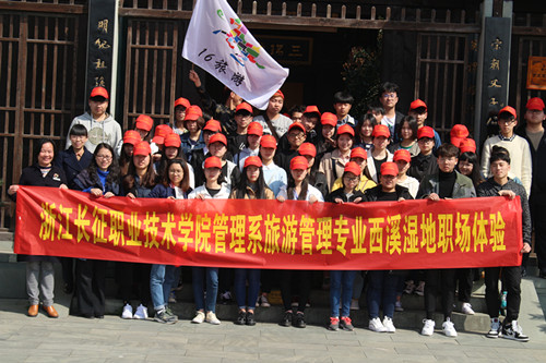 3月27日上午,16旅游管理班级的学生带着统一的红色鸭舌帽,扛着印有马踏飞燕图的职场体验活动旗帜,在范平老师和潘雅辉老师的带队下来到了西溪国家湿地公园洪园景区开展职场体验活动。