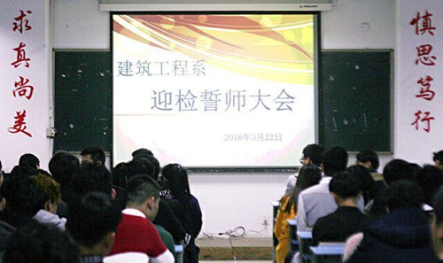 2016年3月22日晚,建工系在1503教室召开了迎检誓师大会。出席本次大会的有建工系系书记胡雯老师、辅导员章剑飞老师及建工系全体学生会成员。