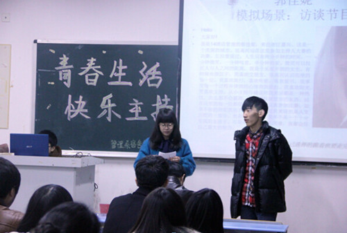 为了响应学院“建设高品质校园文化,丰富大学生精神生活”的号召,管理系宿舍管理委员会于2014年12月17日在1号教学楼1302教室举办了主题为“青春生活,快乐主持”的主持人大赛活动。担任本次大赛评委的有:系团总支书记、辅导员郭洪亮老师以及团总支学生会主席团成员。