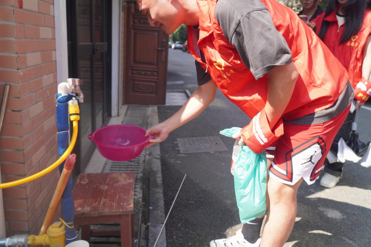 志愿者们分成两组开展巡逻工作。第一组的任务是检查电瓶车是否私拉电线,并及时将发现的情况拍照汇报给社区工作人员。第二组负责清理居民门口花盆中的积水,防止积水成为滋养蚊虫的温床,从而预防登革热等疾病的发生。