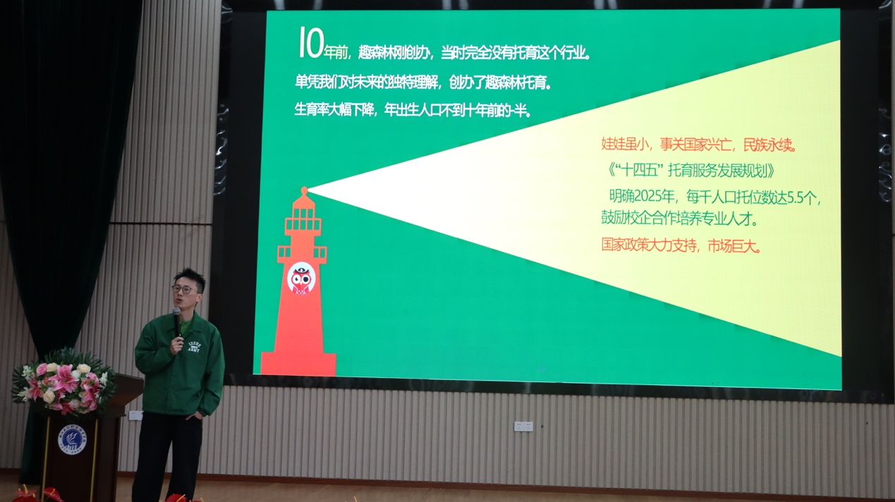 揭牌仪式后,袁雨晨“探索托育职业新未来”为主题开展讲座。作为资深托育行业从业者,他结合国家托育行业扶持政策与最新行业发展数据,深入分析了当前中国托育行业的发展现状,指出国内入托率仍有较大提升空间,托育行业未来发展前景广阔。讲座中,袁雨晨还分享了趣森林托育的多年办托经验、特色课程体系构建思路及品牌连锁发展历程,并与现场学生互动交流,鼓励同学们坚定专业信念,主动提升专业素养,以饱满的热情投身托育事业,把握行业发展机遇。
