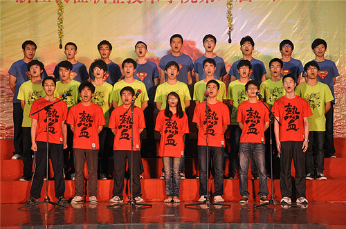 参赛的师生们以专业的唱功、高昂的音质、颇具穿透力的表演,与红色调为主的舞台交相辉映。各系还运用了别出心裁的创意将歌曲演绎地更富有感染力:如语言系自选歌曲《明天会更好》邀请外教老师与3位学生进行小组领唱及学生现场表演书法,管理系合唱《歌唱祖国》时的激情朗诵及热情洋溢的歌声,《红星闪闪》的优美和声及腰鼓助阵掀起了赛场高潮,各参赛队演绎的革命热情和中华民族的英雄气概,赢得了现场观众阵阵掌声。比赛最后,浙江工业大学的合唱团受邀为大家带来的《精忠报国》再一次让现场观众热情激扬。