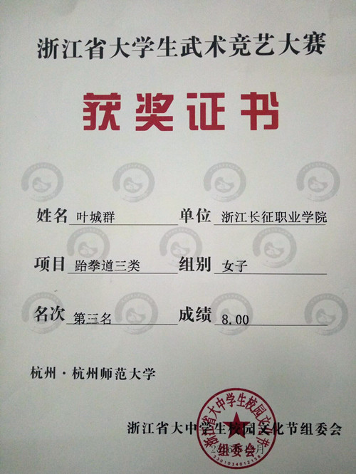 我院武术协会代表队在领队老师、教练李秋冬老师的带领下参加比赛。在个人竞艺比赛中,我院选手凭借熟练的技术,超人的体能和过硬的心理能力,拿下了男子跆拳道一类第四名、男子军体拳第五名、男子跆拳道九类第七名、女子跆拳道三类第三名、女子跆拳道一类第七名的好成绩。在原题竞艺项目中,我校队伍通过坚强的意志、顽强的斗志、清醒的头脑及默契的团队合作,在各个豪强高校中取得跆拳道团体竞艺第三名的佳绩。