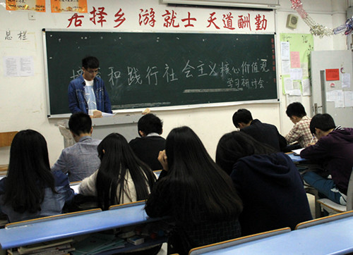 为了深入学习贯彻习近平总书记系列重要讲话精神,牢牢把握正确舆论导向,扎实推进社会主义核心价值观建设,2014年10月14日下午5点,我院团委在2209教室召开培育和践行社会主义核心价值观主题学习会。学院学生会、社团学生干部参加了此次学习会。