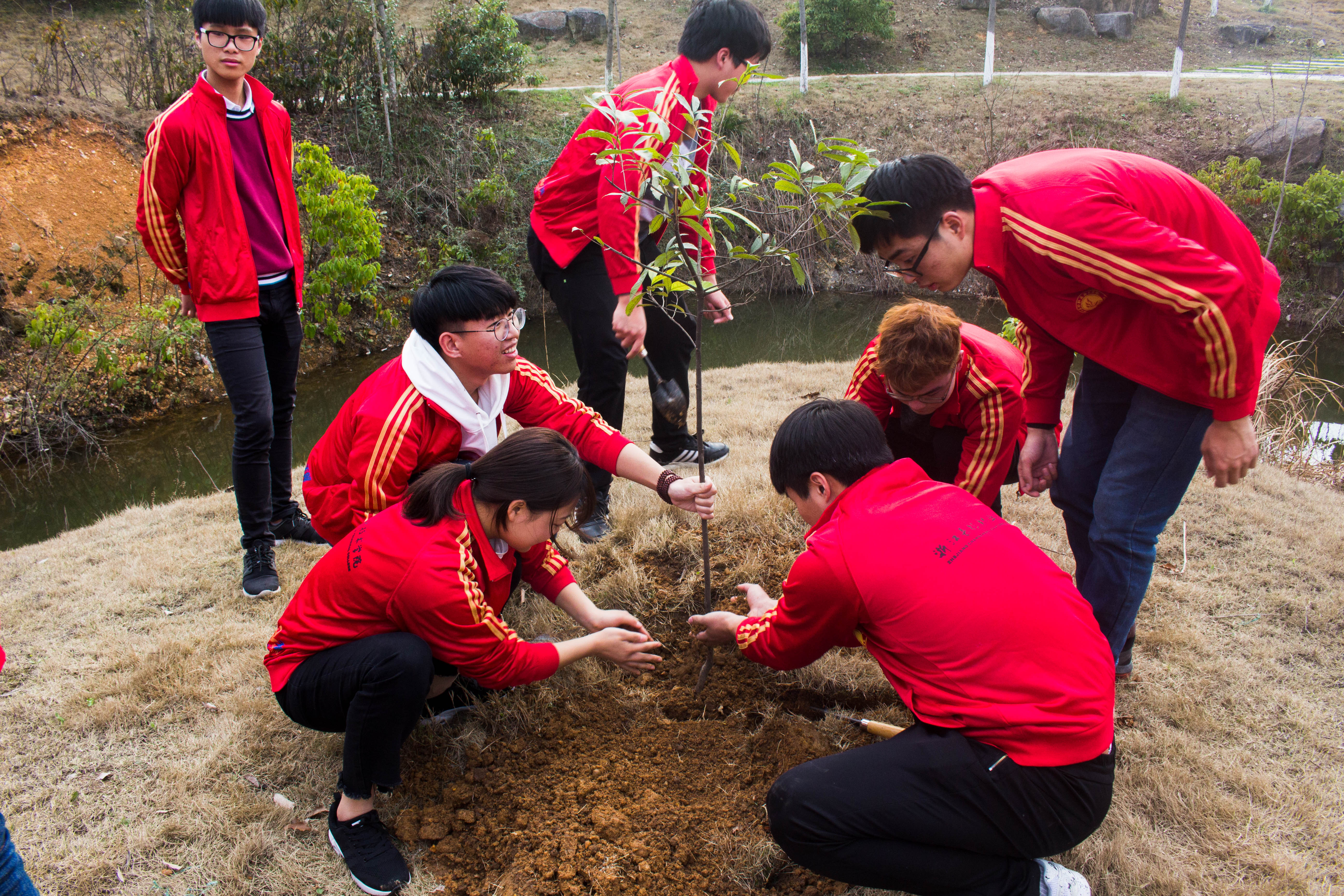 植树活动中,同学们分工合作,挖坑、栽植、填土、浇水,大家都热情高昂、干劲十足,配合默契,将一棵棵充满生机和希望的树苗植入校园。
